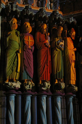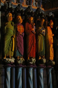 El pórtico de Santa María es la primera de las fases que se considera concluida. Aún permanece cerrado a los viandantes pero se puede visitar e incluso se programa por las noches un espectáculo que reproduce con luces la policromía original que se ha podido descubrir en los estudios exhaustivos (mirad la imagen de abajo). Si vais a visitarla y os fijáis bien, se pueden observar restos en fragmentos concretos de las figuras que dan una idea del esplendor «original» de las decoraciones. Se llevó a cabo un análisis minucioso a microscopio con el fin de recuperar información sobre la policromía del pórtico y realizar una carta de correspondencia que permitiera hacerse una idea global de su aspecto. Se tomaron micromuestras de policromía, de sales y de morteros para ser estudiadas en el laboratorio. El punto donde más muestras de policromía se han extraído, ha sido en el parteluz de la Virgen, con un total de 26 debido al gran número de capas de color superpuestas de se han encontrado. Se procedió a reconstruir gráficamente las policromías con un programa de tratamiento de imagen con el fin de poder reconstruir la evolución cromática del pórtico sin dañar ni eliminar ni una sola de sus policromías. Teniendo en cuenta el estado de conservación de los materiales, de acuerdo con los criterios actuales predominantes, se optó por un tratamiento puramente conservativo que asegurara la duración en el tiempo del conjunto sin practicar ninguna intervención innecesaria. Se saneó el monumento, eliminando las causas principales de deterioro pero respetando todas las huellas, restos, reposiciones, morteros y capas de color correspondientes a intervenciones anteriores, siempre y cuando no causaran perjuicio o desvirtuaran el aspecto real.