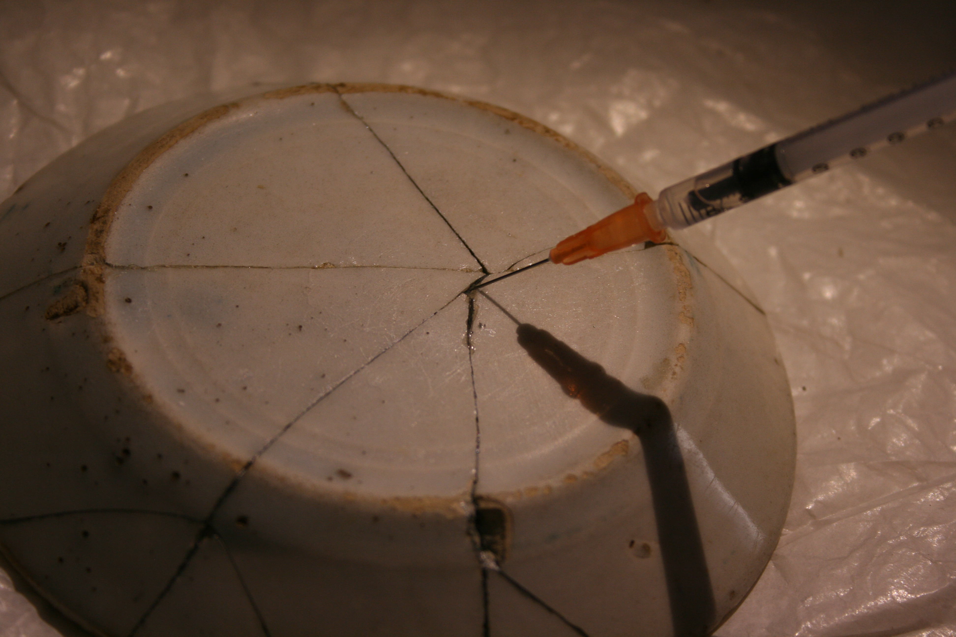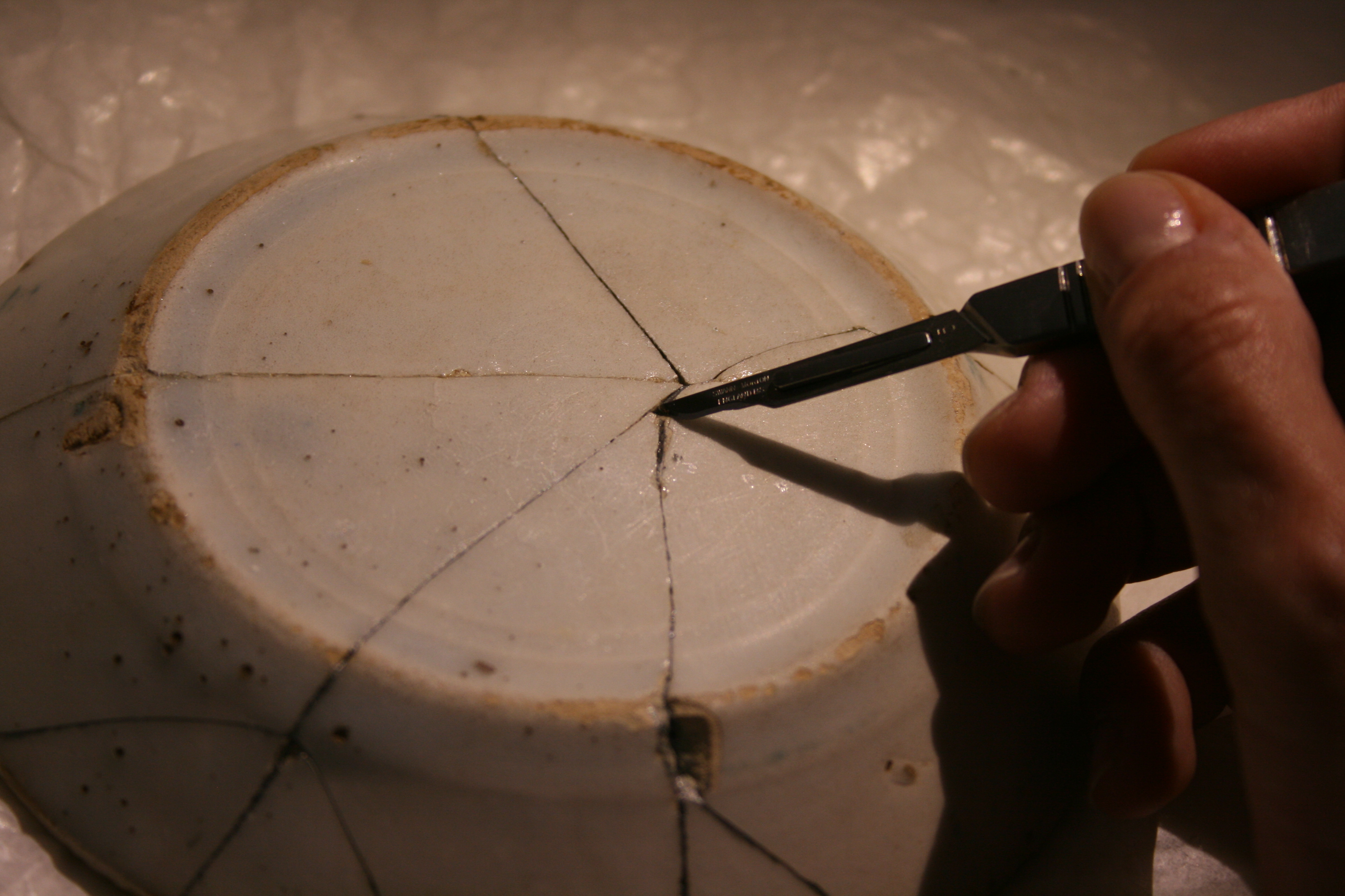 Había estado recompuesto muchas décadas atrás y las piezas estaban mal encajadas, deformando el motivo central. Se decidió separarlas inyectando disolvente en las ranuras del encaje y limpiar bien la cola. Por suerte, los fragmentos se separaron fácilmente sin necesidad de ejercer una excesiva fuerza mecánica y sin sufrir desgaste alguno. Una vez preparadas, se volvieron a recomponer con una cola especial para cerámica, totalmente reversible y que no deja restos de color al envejecer como había pasado con la anterior.