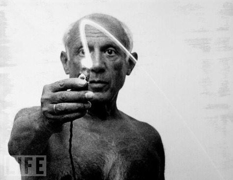 En 1949, el fotógrafo Gjon Milli que trabajaba para la revista Life, visitó al artista en su residencia del sur de Francia. Le mostró unas imágenes tomadas a unos skaters, con luces en sus patinetes, que creaban formas aleatorias con su movimiento. Y a Picasso le encantó. De ahí nació esta serie de fotografías, donde el artista dibujaba en el aire con ese estilo tan característico, sirviéndose solamente de un puntero de luz.